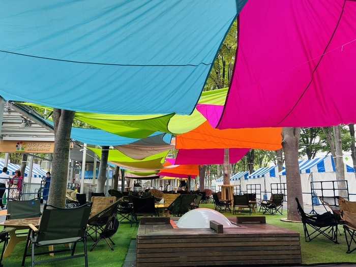 予約制のため、テーブルとイス付きのゆったりとしたスペースが確保でき、場所取りの心配もありません。テントが強い日差しを遮ってくれるので、安心してお過ごしいただけます。夜は専用LEDランタンをテーブルに設置。素敵な雰囲気の中、ゆったり美味しい料理やクラフトビールが楽しめます。