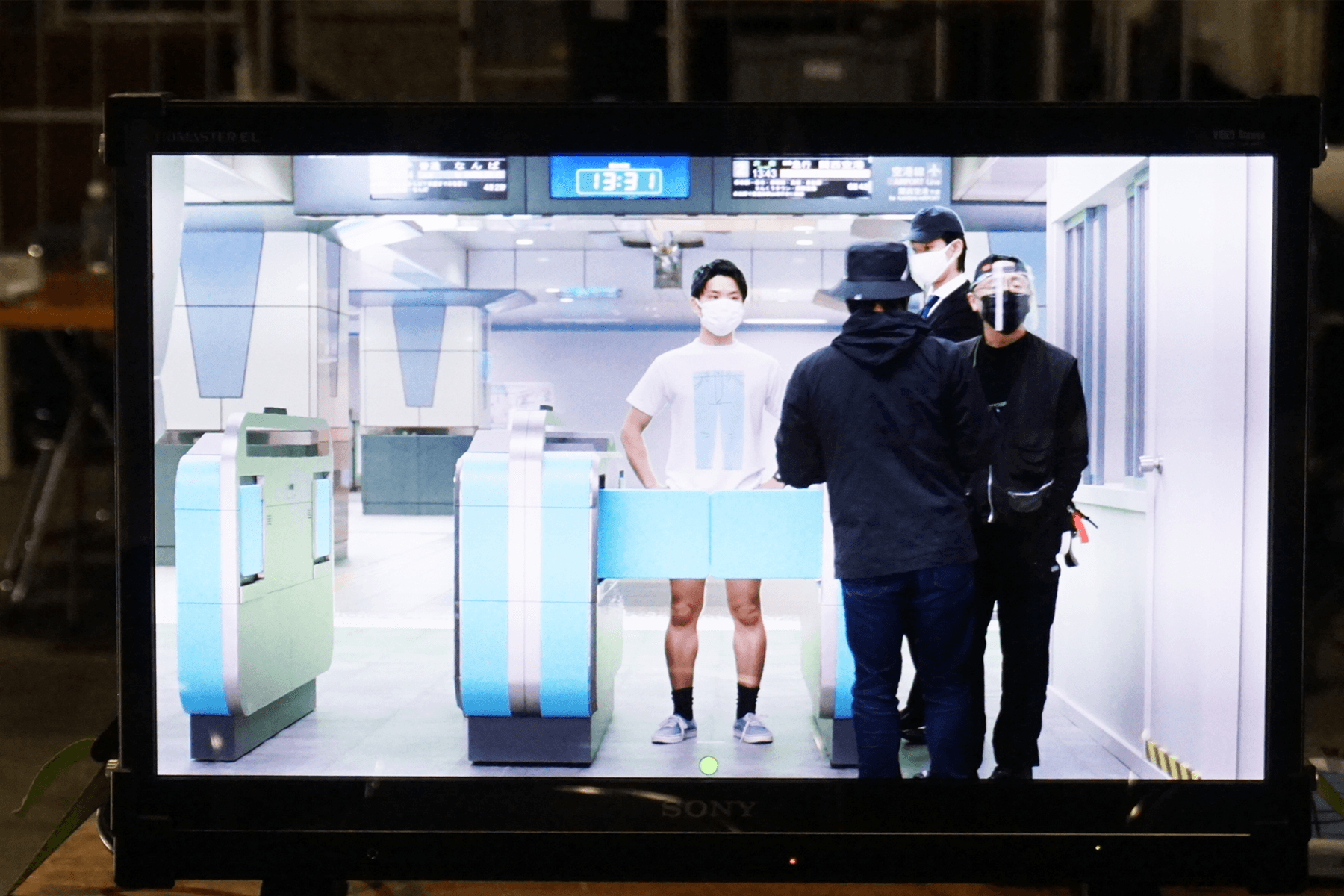 ▼「穿けやパンツ」篇のカギとなる(?)改札ドアの高さ。山内さんと同じ身長のスタッフさんが入念に高さチェックを行いました。ちなみに撮影中の山内さんはカメラが回っていない時間は上からロングコートを羽織って防寒されていました。肌寒い中ありがとうございました。