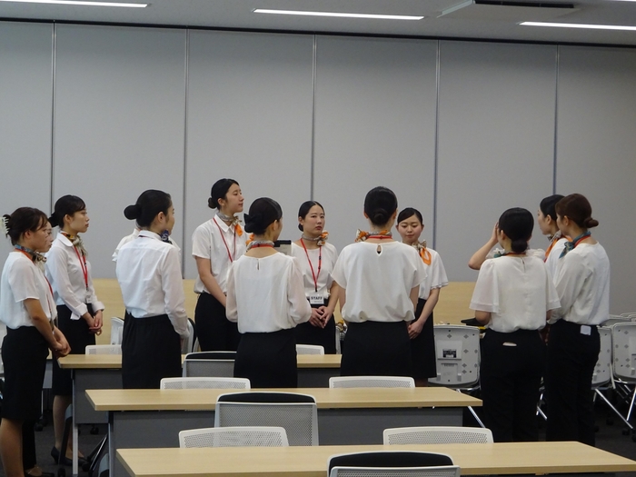 エアライン就職サポート【M-CAP】では、1日につき3回にわたり説明会を実施。各回エアライン業界の魅力や【M-CAP】のプログラムの特長をお伝えしました。さらに先輩たちとの交流の時間をたっぷり設け、個別の質問に優しく答えながら、希望者にはスカーフを巻き、空を背景にしたフォトスポットで一緒に写真撮影を楽しみました。