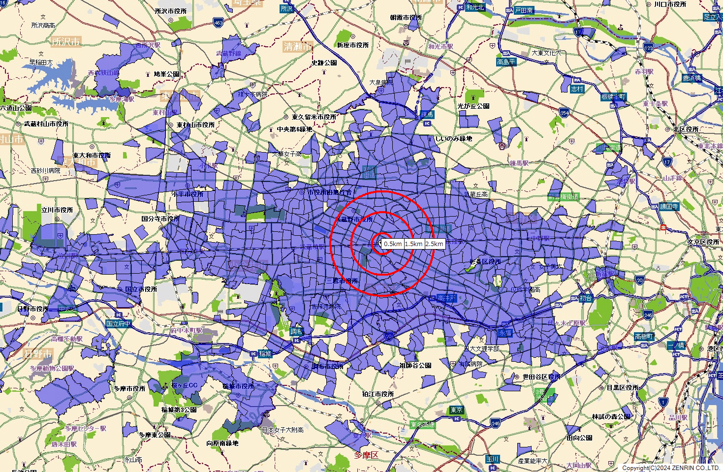 地図上に商圏範囲の円を表示。さらに、一定の来訪者数で絞り込んだ町丁目のみを抽出した画像が上記です。