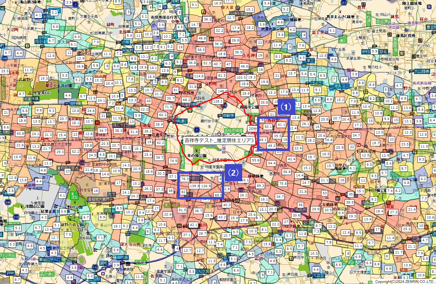 例えば、上記はある期間における吉祥寺駅周辺への来訪者(20~60代)の推定居住エリアを町丁目単位でヒートマップ化したものです。