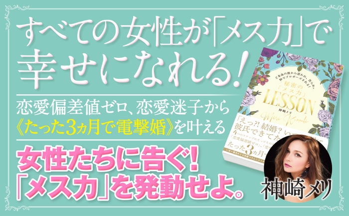 恋愛コラムニスト、神崎メリさん著『ど本命の彼から追われ、告られ、秒でプロポーズされる! 秘密のメス力LESSON』(SBクリエイティブ)が5回目の重版決定したことを記念し、アマゾンで2020/10/08(木)00: 00から2021/03/05(金) 23: 59までに本書を購入した方に「メス力診断ーあなたのためにメス力指南します―(PDFデータ)」のダウンロードURLをメールにて通知する形の期間限定特典を実施します。