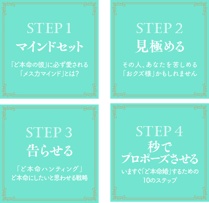 本書では下図の「4つのステップ」に沿って行動するだけで、3ヵ月で「ど本命」の男性と電撃婚を叶える「メス力」の実践法を紹介しています。