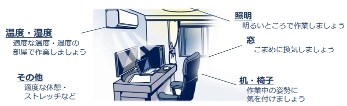 「自宅等においてテレワークを行う際の作業環境を確認するためのチェックリスト【労働者用】」を活用すること等により、自宅等の作業環境に関する状況の報告を求めるとともに、必要な場合には労使が協力して改善を図ったり、サテライトオフィス等の活用を検討することが重要です。