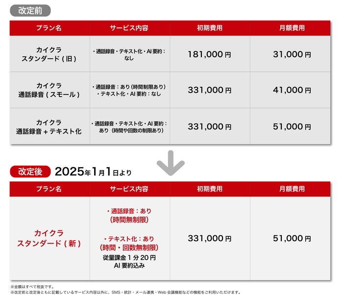 シンカは2014年8月のサービス開始以来、コミュニケーションプラットフォーム「カイクラ」の機能拡張を定期的に実施してまいりました。お客様ひとり一人の声を大切にし、2024年9月末現在で全国2,700社を超える幅広い業種の企業にご利用いただいております。このたび、円安の影響やインフラコストの増大等による事業環境の変化を受け、2025年1月1日以降に販売するプランについて利用価格の改定を行うことになりました。