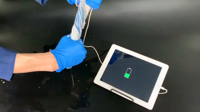 繊維関連技術の進化によって、繊維で充電やディスプレイ表示が可能な時代がやってくる日も近い!? 繊維リチウムイオン電池で1メートルの長さがあれば、スマートフォンや、心拍モニター、血中酸素モニターなどを備えるウェアブル端末に対し断続的に電源を供給することができるそうです。また、折り曲げにも強く、曲げ半径1センチの折り曲げを10万回実施した後でも電池容量が80%以上を保つほか、水や圧力の環境下においても安定した性能を発揮するという夢のような技術を紹介しています。