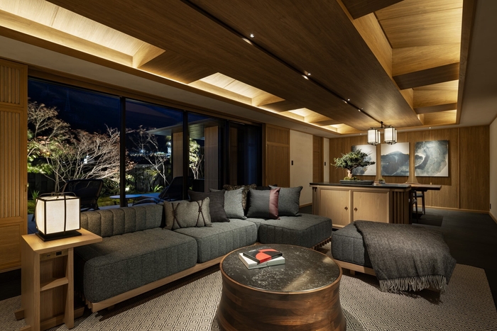 全てオーダーメイドで特注した家具類、アートワーク、照明器具の数々に、部屋毎に異なる植栽の剪定を施したテラスの日本庭園。