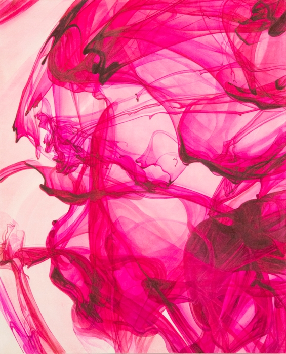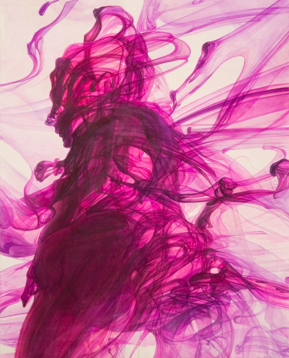 水中に落ちた墨が偶然、人形の模様を取った瞬間の写真をモチーフに日本画の技法を用いた絵画を制作している。