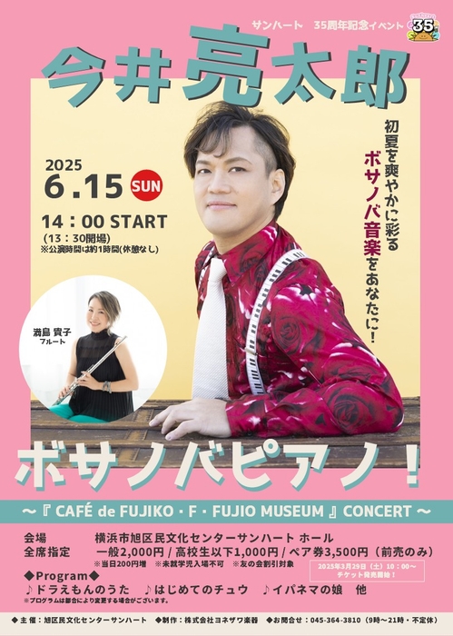 彼が作曲した人気オリジナル曲や、ブラジル音楽の名曲の他に、「川崎市 藤子・F・不二雄ミュージアム」内ミュージアムカフェBGMのために2024年に制作され、KIDS作品チャートで1位を獲得したアルバム『CAFÉ de FUJIKO・F・FUJIO MUSEUM』の中から、「ドラえもんのうた」「夢をかなえてドラえもん」なども、ピアノとフルートで奏でる、サイコーにハッピーなコンサート!