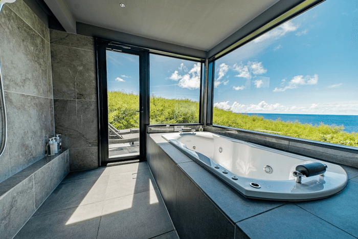 海が一望できるジェットバスで夕日が刻々と海に沈む様子を眺めて最高のリラックスタイムに。
