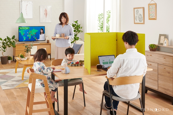 視線を遮るだけでなく、囲われた空間の内外の音をTRANQORDが吸音し和らげることで、自宅内でオンとオフが混在することによる気疲れを解消し、完全な分離とは違った家族との心地良い距離感を作り出します。