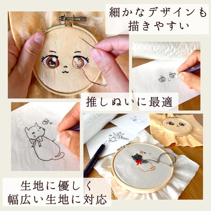 このシートは水に濡らすと自然と溶ける素材で作られています。従来の刺しゅうでは難しかった細かなデザインも、このシートを使うことで綺麗な刺しゅうが完成します。タオルやニットなど表面がふわふわしている生地/薄手且つ伸びる繊細な生地にも対応可能。さらに手縫いや刺しゅうミシンなど種類を問わずお使いいただける汎用性の高さも魅力の1つです。