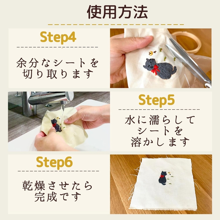 使い方はとてもシンプル!まずはシートに下絵を写します。次にシートを生地の上に被せた状態で刺しゅう枠にセットしたら準備完了です。刺しゅうが完成したら余分なシートを切り取り、最後に水に濡らしてシートを溶かし生地を乾燥させたら出来上がり!ビギナーさんや手先が不器用だから不安…といった方でも扱いやすいため、世界に1つだけの特別な作品づくりを気軽にお楽しみいただけます。
