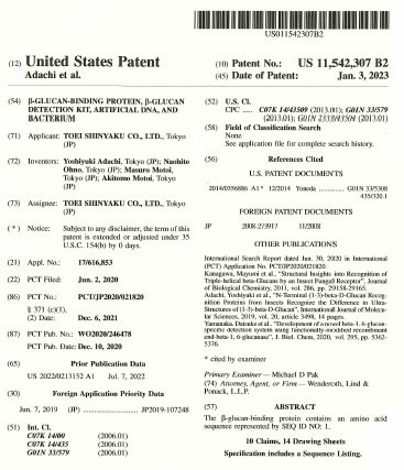 本特許は、東京薬科大学薬学部免疫学教室と共同で行った、当社の露地栽培アガリクスKA21株に関する共同研究の中から発案された技術です。日本国内では2021年10月26日に特許登録されており(特許第6966756号)、今回2023年1月3日にアメリカでも特許登録されました(US11,542,307 B2)。関連する技術として、先行して登録された特許「β-1,6-グルカナーゼ変異体とβ-1,6-グルカンの測定方法(日本国内特許第70529676号、米国特許US11,479,803 B2」、2020年9月7日に特許出願した「β-1,6-分岐β-1,3-グルカンまたはβ-1,3-グルカンの検出・定量方法および検出・定量キット(特願2020-149797)」があります。(どちらも特許権者は当社 東栄新薬株式会社)