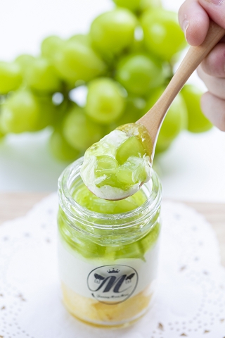 マスカットのティラミスクリームの下には、チェリーの洋酒で風味をつけた、ふわふわのスポンジ生地を敷きました。さらにクリームの上には刻んだシャインマスカットと、マスカットのジュレソースを乗せています。見た目も爽やかな、夏の時期にピッタリのティラミスです。