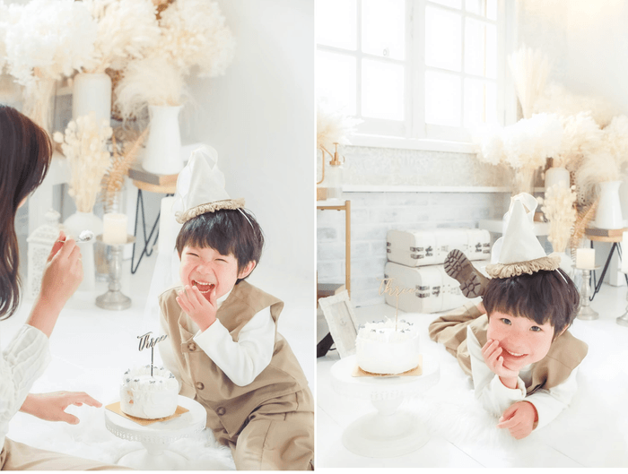 スマッシュケーキ撮影を行っているフォトスタジオのほとんどが1歳のお誕生日までですが、ライフスタジオ青山店と小山店では3歳のバースデー撮影までご希望があればスマッシュケーキ・バースデーケーキと撮影ができます。