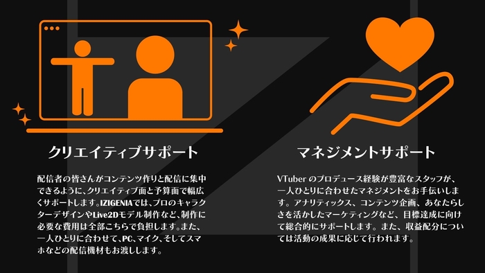 国内外の有力クリエイターが集結し、キャラクターデザイン、Live2Dモデル制作などのクリエイティブ面を全面支援します。また、タレントが安心して活動できるよう、機材支援およびパフォーマンスに応じた柔軟なインセンティブ制度を整備しております。