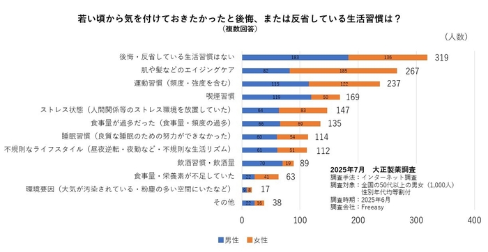大正製薬が2025年6月に全国の50歳以上の男女1000人を対象に行ったアンケート調査によると、「若い頃から気を付けておきたかったと後悔、または反省している生活習慣は?」という質問に対して、3割以上の方が「後悔・反省している生活習慣はない」(319人)と回答していますが、後悔、または反省していることのトップ5は「肌や髪などのエイジングケア」(267人)、「運動習慣(頻度・強度を含む)」(237人)、「喫煙習慣」(169人)、「ストレス状態(人間関係等のストレス環境を放置していた)」(147人)、「食事量が過多だった(食事量・頻度の過多)」(135人)という順になりました。