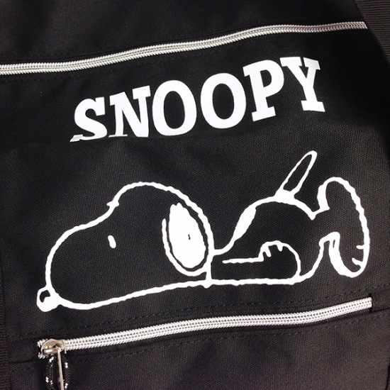 スヌーピーが寝そべっていてかわいいですね。正面についているチャック付きのポケットも便利です。