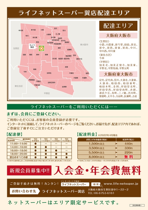 “おいしい” “ワクワク” “ハッピー” をお届けするライフコーポレーションは、4月20日(水)より大阪市生野区の「ライフ巽(たつみ)店」で「ライフネットスーパー」のサービスを開始いたしました。これまで近隣のライフから配送していたエリアに加えて、大阪市内・東大阪市内の配達エリアの拡大が実現いたしました。