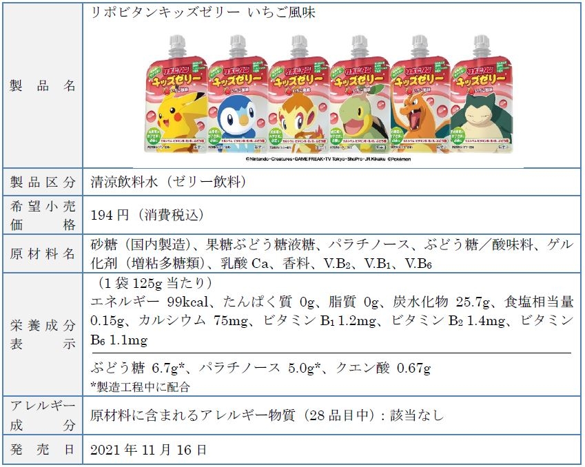 「リポビタンキッズゼリー いちご風味」は、成長期のお子さまに必要な栄養素であるビタミンB1・B2・B6、カルシウムを配合した清涼飲料水(ゼリー飲料)です。運動のためのエネルギーとなるぶどう糖を配合している他、熱中症対策※1にもおすすめです。保存料・酸化防止剤・アレルギー物質(28品目)・カフェイン不使用とお子さまにやさしい設計となっています。風味は、お子さまが好きな果物第1位※2となっている「いちご」の風味にしました。2021年1月に発売したぶどう風味(無果汁)に加えて、2種類の風味から選ぶことができるラインアップとなりました。パッケージデザインは、ポケモンの中でもお馴染みの「ピカチュウ」「ポッチャマ」などを採用し、お子さまにとって、見た目にも楽しく、成長に必要な栄養素を摂取していただけるゼリー飲料です。