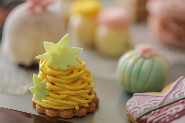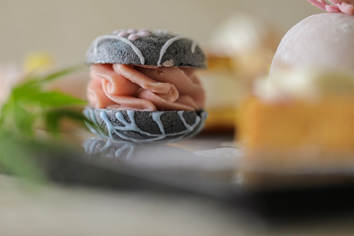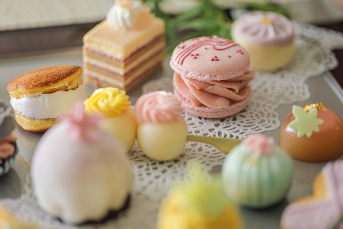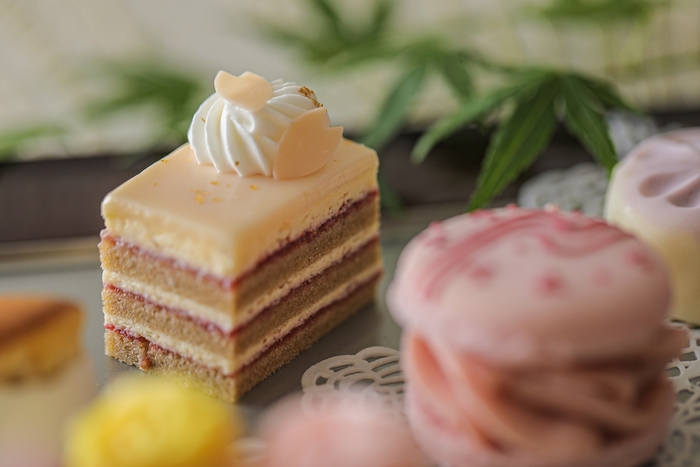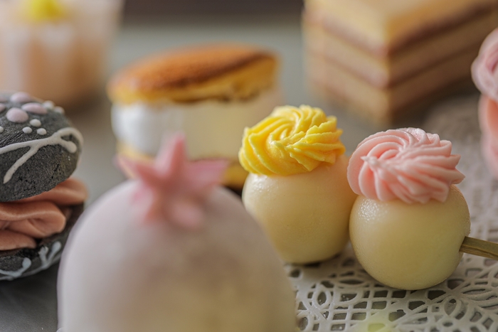 カラフルクリーム団子/もなかのトゥンカロン/どらやき風パンケーキのマリトッツォ/着物柄アイシングクッキー/さくらんぼオペラ/ベリーとチーズのタルト/苺ムース大福(ぎゅうひに包まれたムースケーキ)/羊羹風の桃と白ワインジュレ/練り切り風ボンボンショコラ/ういろう風お花のケーキ