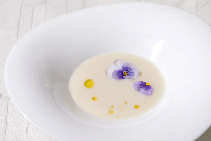 ヴィシソワーズから始まり、次にパティシエのスペシャリテ“My Fair Lady(ベリー&バイオレットムース)”を提供。ハットを被った女性をイメージしたデザインが可愛らしく、口に入れるとすみれの花の香りが口いっぱいに広がる、パティシエこだわりの一品に。