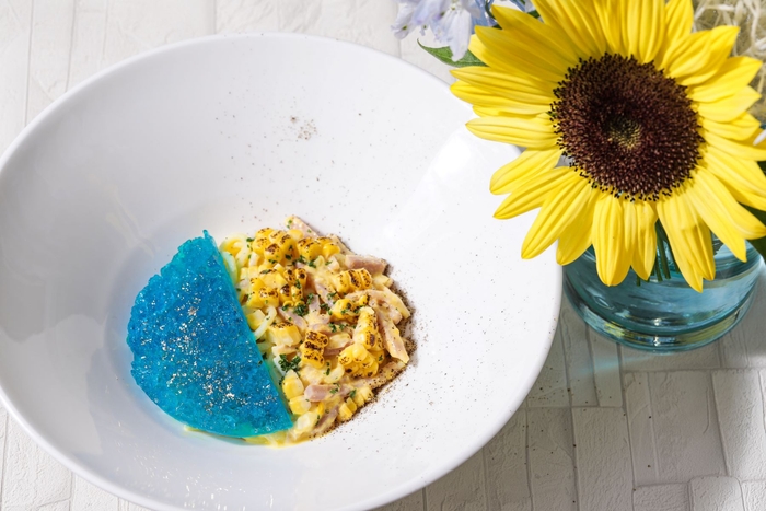 【パスタ】とうもろこしの冷製パスタ ブルーの出汁ジュレを添えて(+1,500円 消費税・サービス料込)