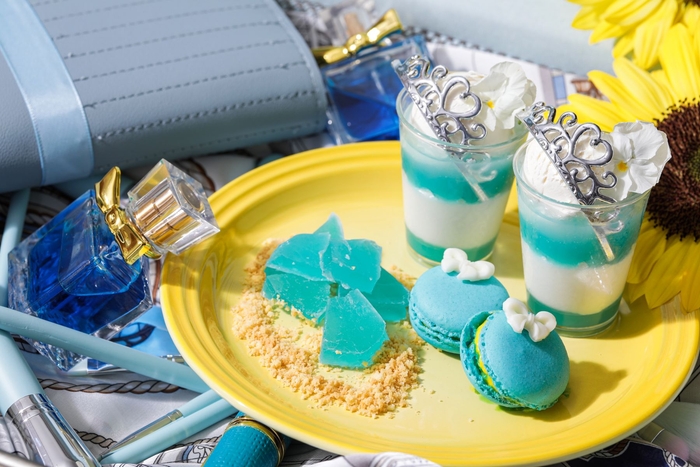 メインのスタンドは、ブルーとイエローカラーで統一し、大人かわいい女性を表現するため“ティアラやリボン、ハイヒール”などのファッションアイテムをスイーツのモチーフに。また、琥珀糖で“シーグラス”を表現するなど、細部まで趣向を凝らしたスイーツに仕上げました。見た目のこだわり以外にも、ライチ・ココナッツ・ライム・レモン・パッションフルーツなどを使用することで、夏に嬉しい爽やかな味わいをお楽しみいただけます。