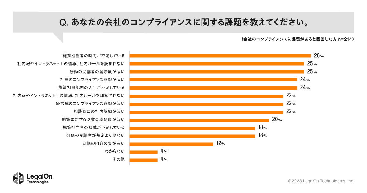 企業のコンプライアンスに関する課題が「ある」と回答した担当者は7割を超えました。コンプライアンスに課題があると回答した方に、課題について伺ったところ、上位3つに挙げられたのは、「施策担当者の時間が不足している」(26%)、「社内報やイントラネット上の情報、社内ルールを読まれない」(25%)、「研修の受講者の習熟度が低い」(25%)でした。