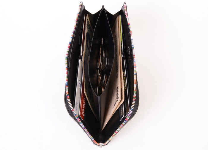 シンプルな外装ではありますが、内装のカードポケットや小銭、お札収納も取り出しやすく、スリムながらもしっかりと収納することができます。両サイドにお札を収納できるスペースがあり、空いたスペースにはスマホを入れることができるのでひとつにまとめて持ち運びにも便利です。