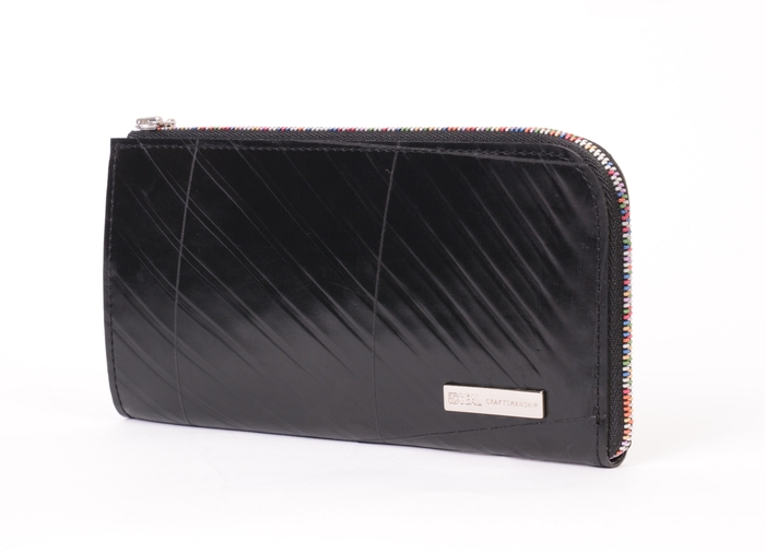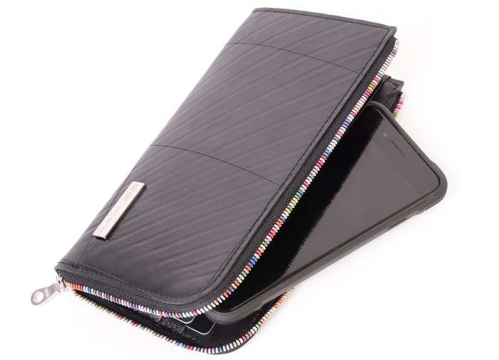 本製品は全面にタイヤチューブ素材を使用し、ワンアクションで開くことができるL字ファスナーを搭載した長財布です。一般的な長財布と比べとても薄く作られており、その薄さは15mm。余計な革を省きシンプルな構造にすることでこの薄さが実現しました。ポケットへの出し入れも行いやすくどんなスタイルでもスムーズに会計を行うことができます。