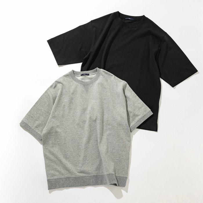 左)ライトウェイトのインレイ裏毛を使用した半袖のスウェットシャツは、リラックス感あるサイズフィットでTシャツ感覚で着れる一枚です。