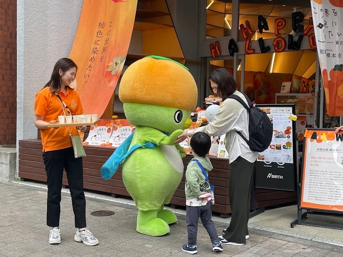 本イベントでは、橋本市のマスコットキャラクター「はしぼう」が登場し会場を盛り上げました。「はしぼう」は、柿のおかっぱヘアーやポッコリとしたおなかが特徴的な「紀の川の妖精」。橋本市の伝統産業の「紀州へら竿」を背負い、体にはふわふわのパイル織物をまとっています。イベント当日は多くの来場者の方と写真撮影等で交流しました。