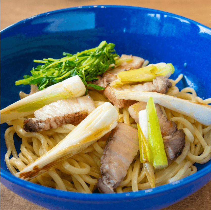 太めの麺を特製だれで和え、手作りベーコンと香ばしい焼きネギをのせた一杯。お好みで一味や山椒を加えれば、さらに奥行きのある味わいに。