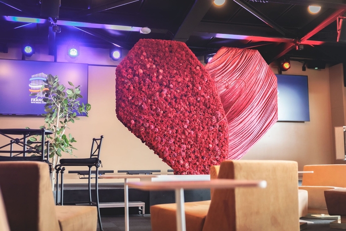 フラワーライフ振興協議会は2025年9月13日、大阪万博フランスパビリオンにて開催された「フランスナショナルデイ」に合わせ、花装飾の施工を担当しました。今回のデザインテーマは「赤い糸」。フランスパビリオンのコンセプト「愛の讃歌」に呼応する形で、愛とつながりを象徴する“赤い糸”をモチーフに、ジャパンフラワーグループ株式会社【ROSE GALLERY】ローズギャラリー Brand Director 武田桃子によるハートオブジェをデザイン、施工デザインをクリエイティブ・フラワー・コーポレーション株式会社、田村陽子が監修しました。