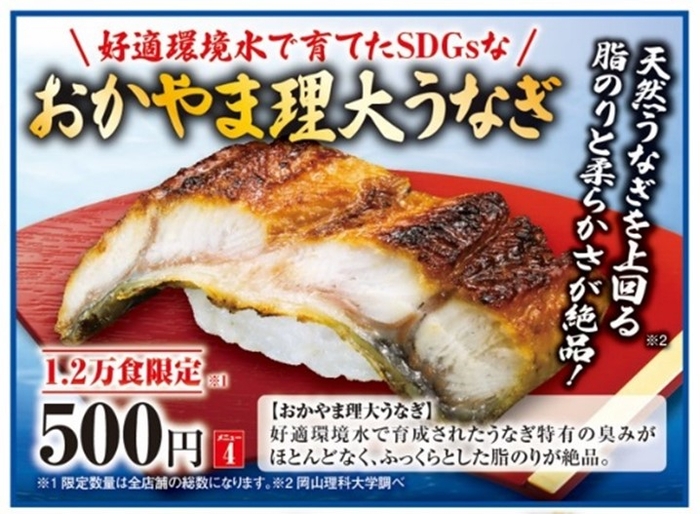好適環境水®で養殖した「おかやま理大うなぎ®」を使った寿司が回転寿司チェーンの「くら寿司」で5月2日(火)から販売されます。1貫500円(一部店舗では価格が異なります)。予定の1万2000食がなくなり次第、終了します。