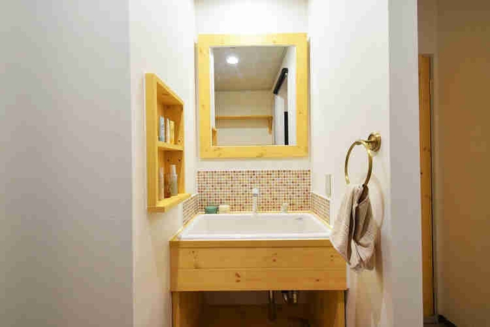 こちらもキッチン扉などに使用されている「無垢材」で作ったもので、これは既製品ではなく職人さんが手作業で作ってくれた一点もの。つまり世界にひとつだけしかない「プレミアム」な洗面台。