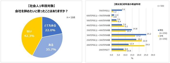 就活生・内定者・社会人1年目の就活実態。 人気業界1位 男性「メーカー」女性「医療・福祉」。 初年度の希望年収「300万円~350万円」。 1年目にして、会社を辞めたい人約6割!