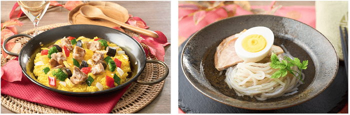 右:秋限定メニュー「天草産あおさと鮭のパエリア」。オレンジに色づく葉っぱを鮭で、黄色に色づくイチョウの葉を栗で表現した、秋をイメージした料理長渾身のメニューをお見逃しなく。