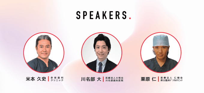 本シンポジウムは、「Innovations in Dentistry, Exploring the Future of Oral Health」(歯科におけるイノベーション、口腔衛生の未来を探る)をメインテーマとし、各分野を代表する著名な臨床家の先生方を講師に迎え、歯科医師向けに3つの講演を披露します。