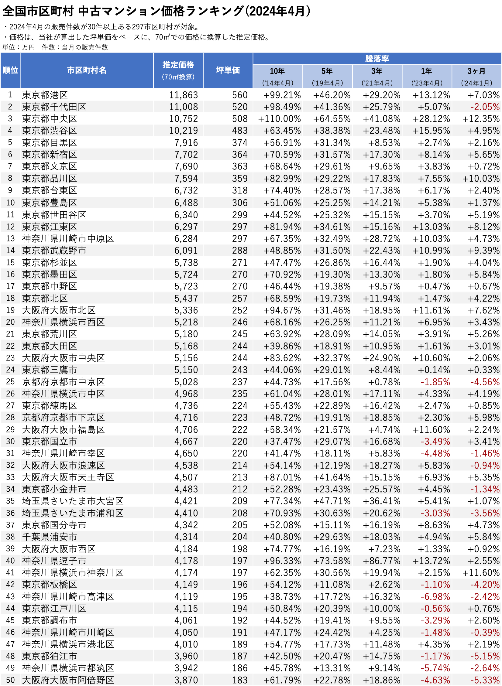 「マンションレビュー」2024年4月 全国市区町村 中古マンション価格/騰落率ランキングを発表
