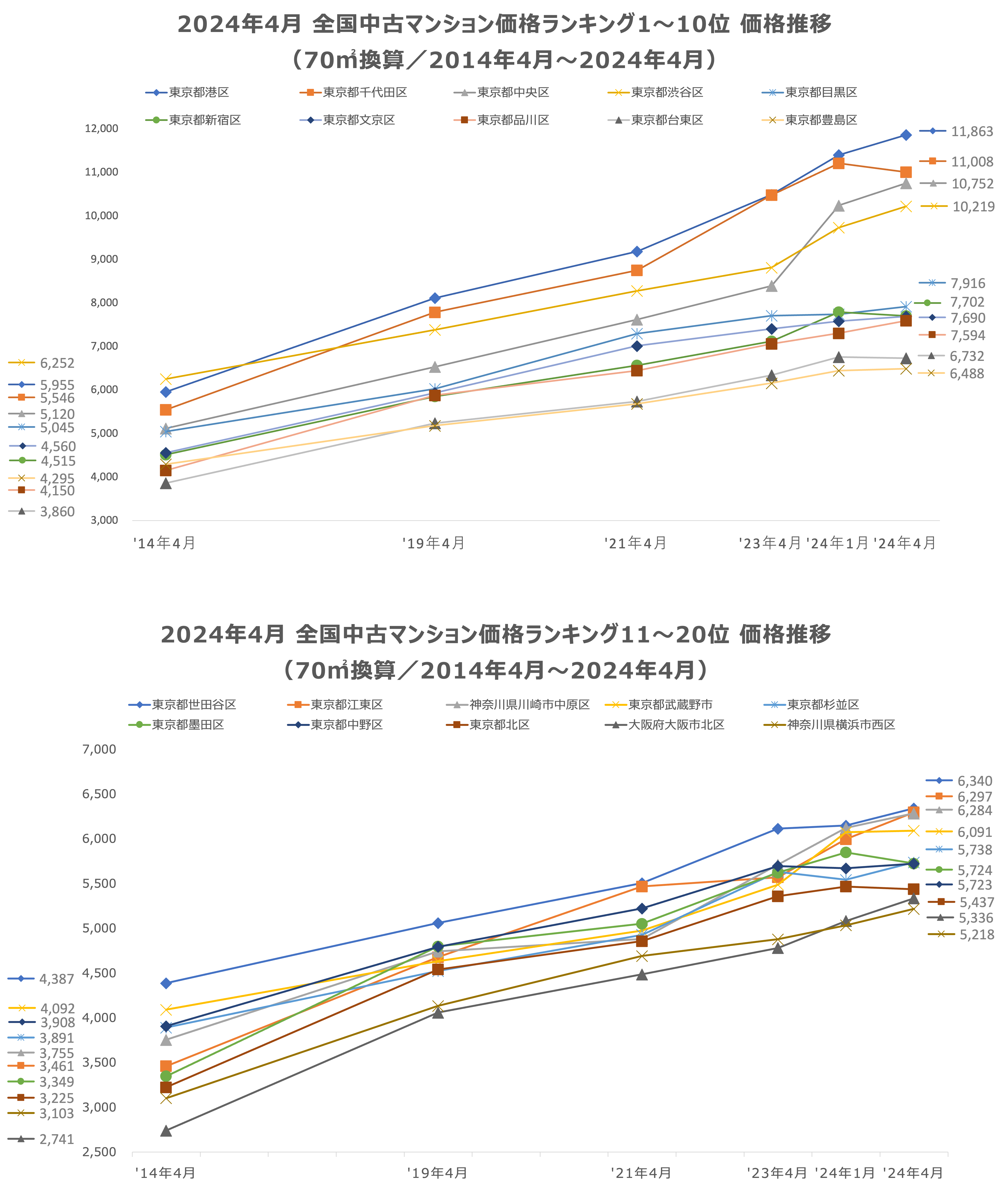 「不動産×WEB×ビッグデータ」の領域で、さまざまな不動産テックサービスを展開する株式会社ワンノブアカインド(本社:東京都港区、代表取締役社長:川島 直也、以下当社)は、当社が運営するマンション情報サイト「マンションレビュー」の保有データを元に、2024年2月の全国市区町村における中古マンションの相場を調査。坪単価をベースに70㎡での価格に換算した「中古マンション価格」*1と価格ランキング上位20件について過去10年間の価格推移、および1年前からの価格の上昇率を表す「騰落率」のランキングを発表いたします。