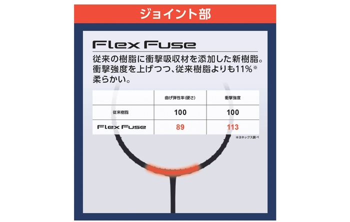 新素材「Flex Fuse」をジョイント部に採用することにより、ASTROX 77使用者に合わせたマイルドな打球感を実現。