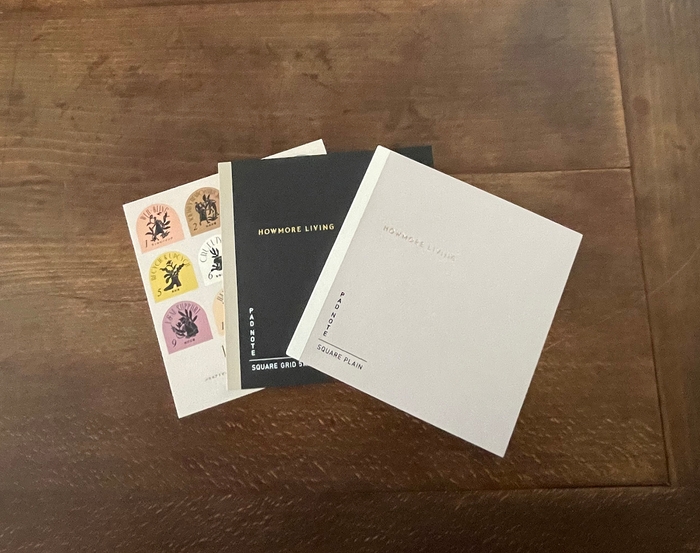 ホチキスを使わず、2つ折りの紙を束ね特殊な製本で仕上げた、メモパッドのように切り離して使うこともできるスクエアノート。表紙には『HOWMORE LIVING』のロゴを箔押し。方眼紙版と無地版をご用意しています。