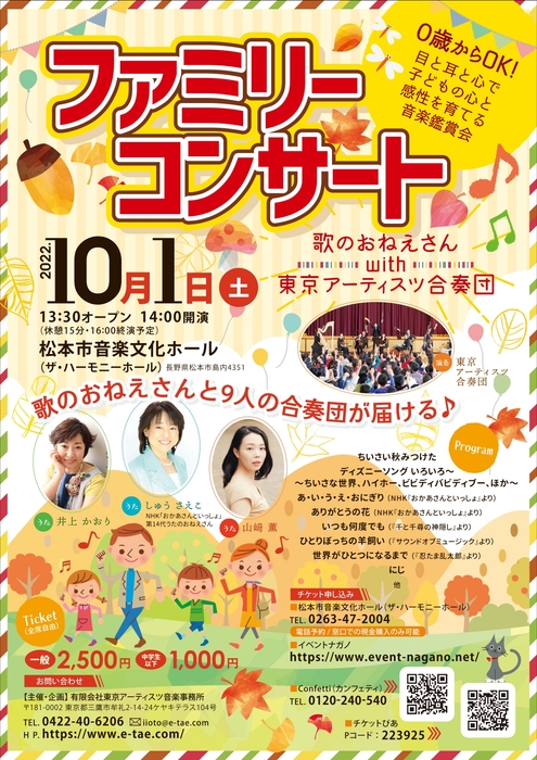 有限会社東京アーティスツ音楽事務所主催、『ファミリーコンサート ~歌のおねえさんwith東京アーティスツ合奏団~』が2022年10月1日 (土)に松本市音楽文化ホール(ザ・ハーモニーホール)(長野県松本市島内4351)にて開催されます。
