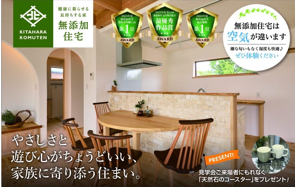 株式会社 無添加住宅(所在地:兵庫県西宮市下大市西町3-24、代表:難波 宏之)の正規代理店である株式会社北原工務店(長野県伊那市)は、2025年8月2日(土)・3日(日)に長野県上伊那郡南箕輪村において、自然素材を活かした「無添加住宅」の完成見学会を開催いたします。
