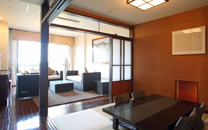 ユーラシアスイートは、洋室、和室、リビング、バルコニー、ビューバスと露天風呂の2種類のお風呂が付いた開放感のある客室です。