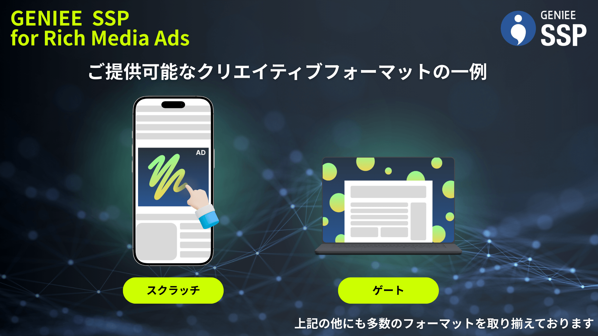 これにより、広告主様はGENIEE SSPが保有している多様なメディアにリッチメディア広告を配信することが可能となります。また、GENIEE SSPをご利用いただいているパブリッシャー(メディア運営者)様には、高単価なリッチメディア広告を通じて、メディアのマネタイズを強化できます。
