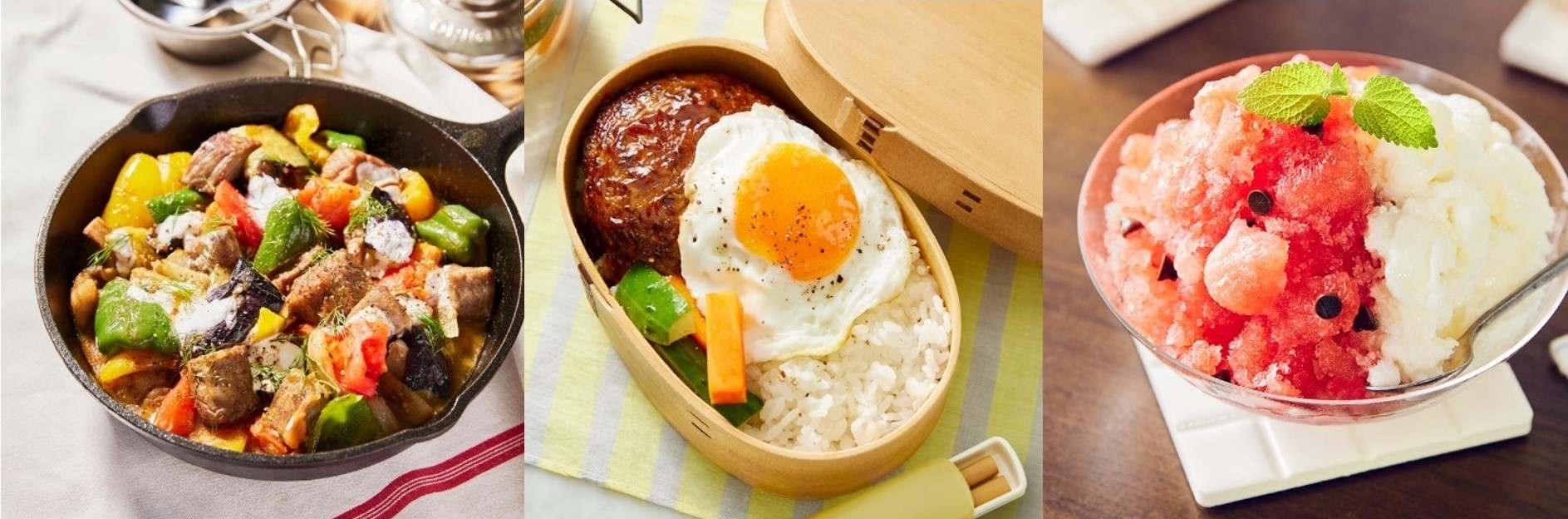 ※画像左は、#国消国産キャンプごはん「ゴロッとジューシー!国産牛のサイコロステーキと夏野菜のガーリックソテーヨーグルトソース」、画像中央は、#国消国産お弁当「ほぼ10分!時短&ボリューム満点!和風ロコモコ弁当」、画像右は、8月3日(水)公開の#国消国産おうちスイーツ「揉むだけ簡単!混ぜて美味しい!ミルク&フルーツシャーベット」になります。詳しいレシピはキャンペーンサイトをご覧ください。